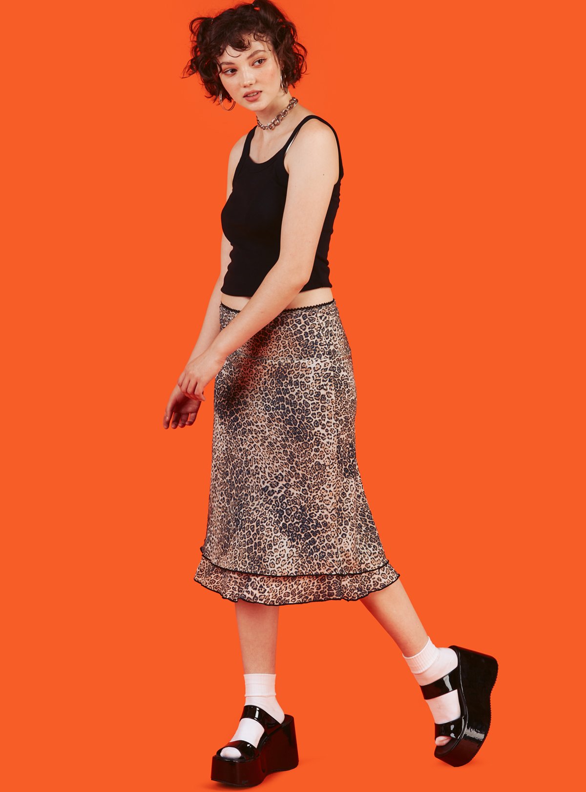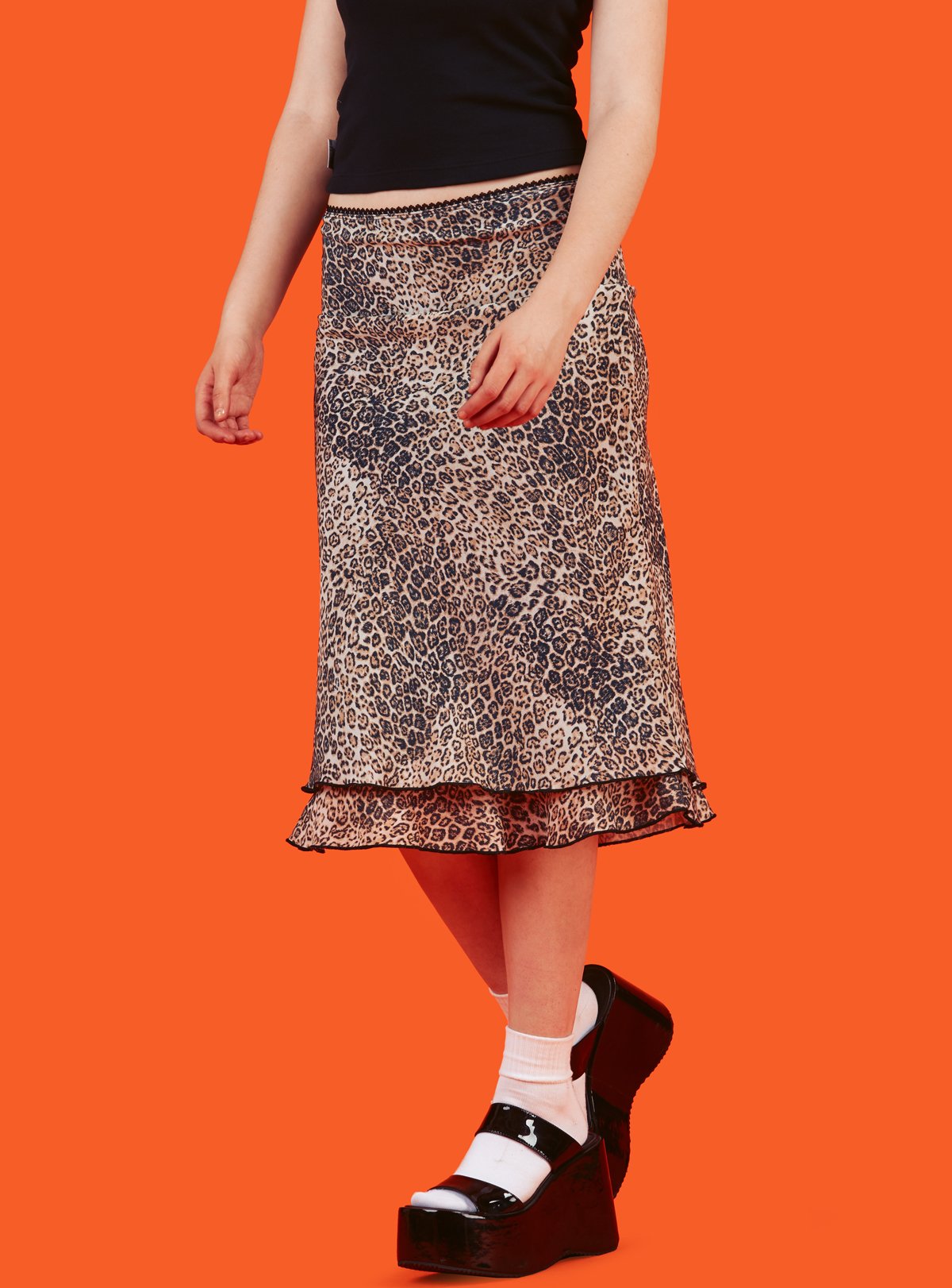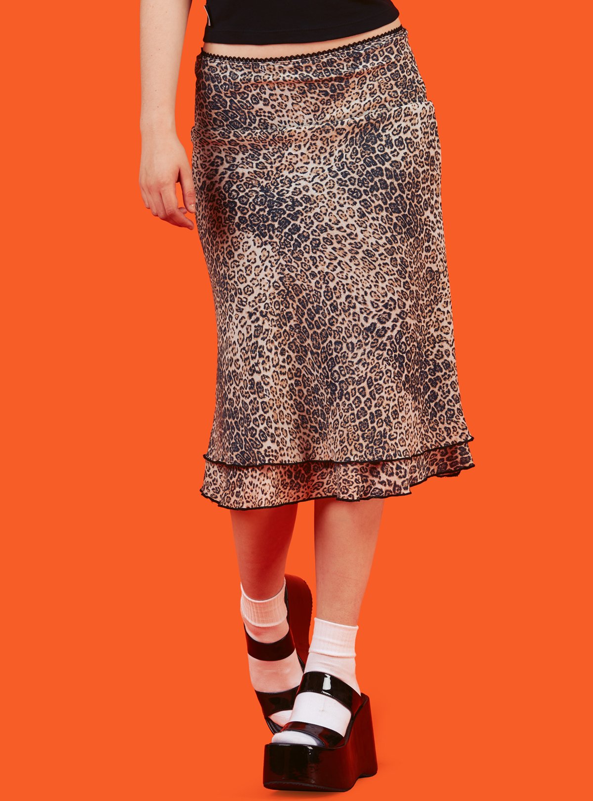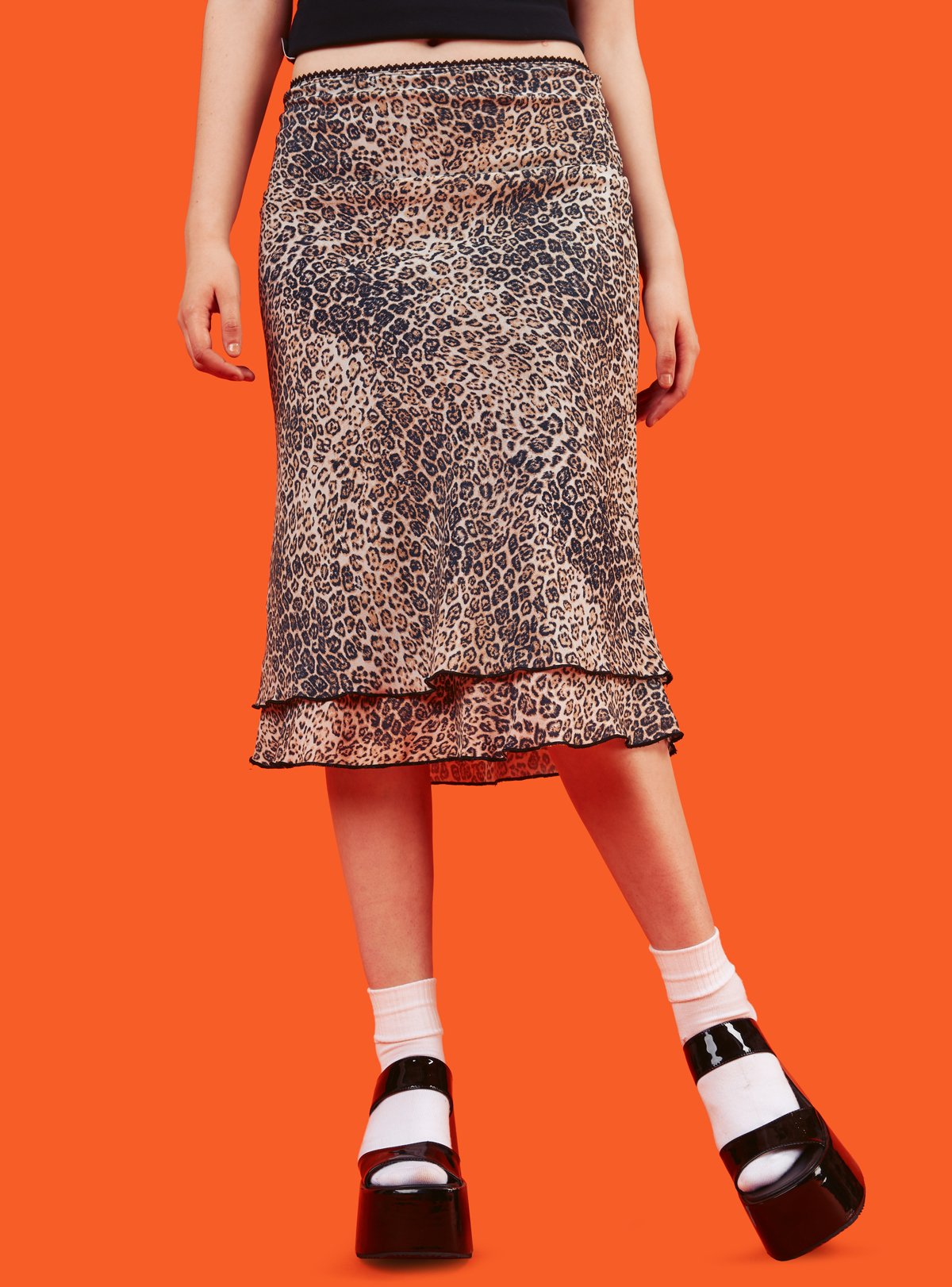 Stretchy, multi-layered leopard skirt with zigzag trim at the waist.