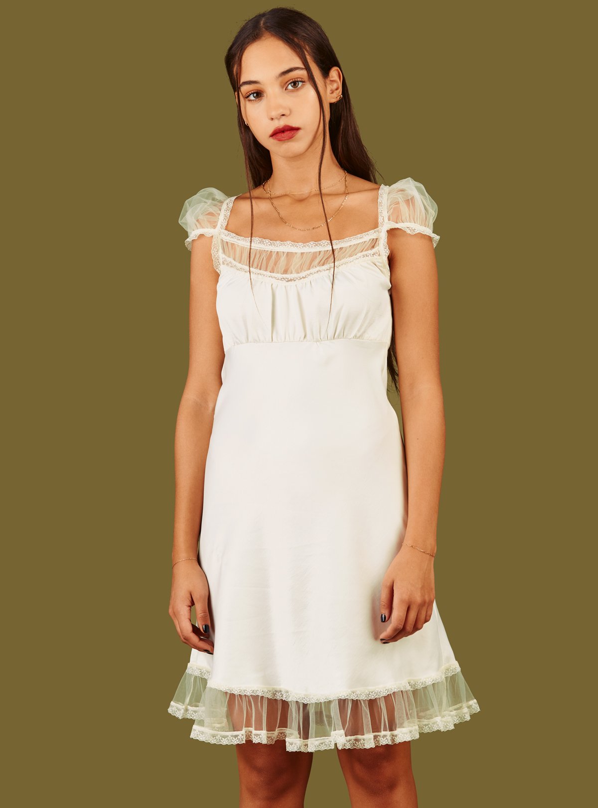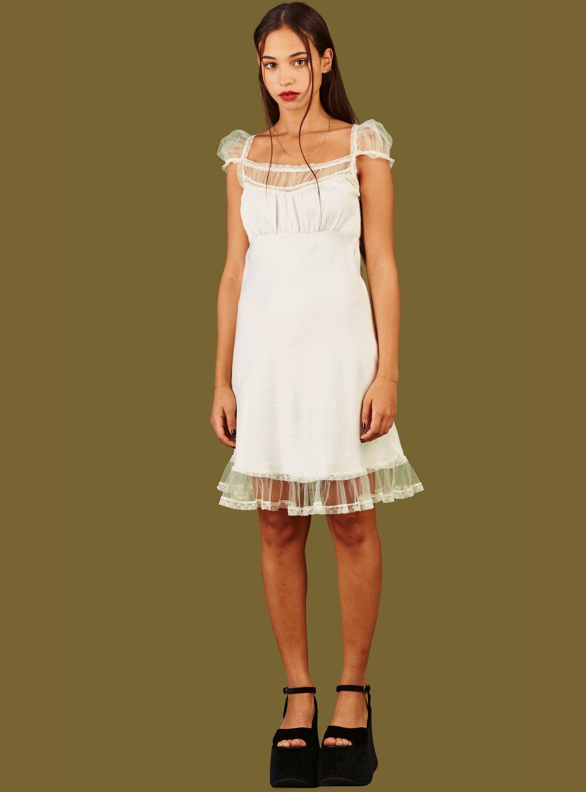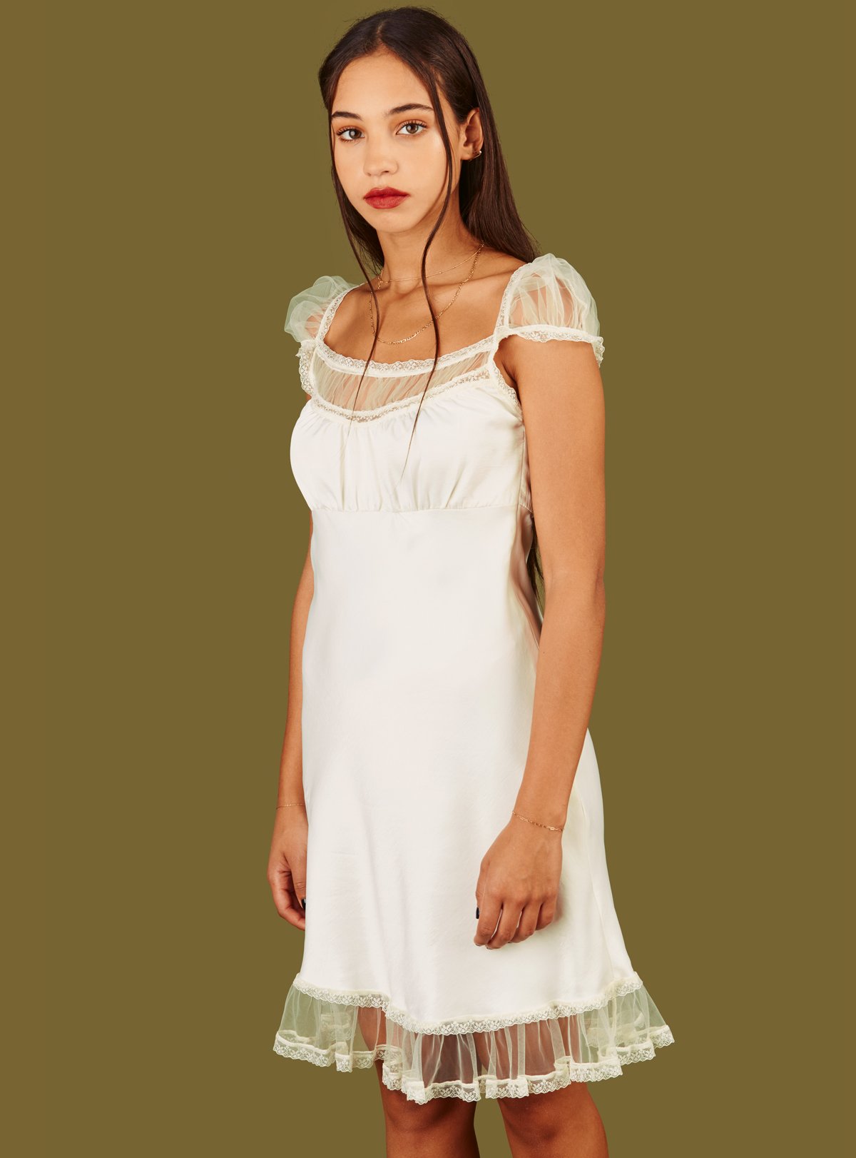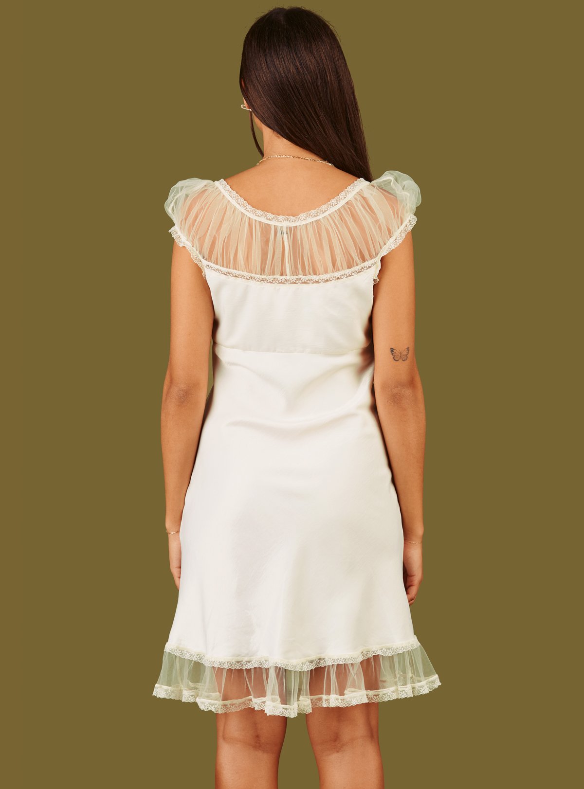 Gorgeous satin crinkle dress with tulle accent details at the shoulders, bust and bottom hem. Truly angelic.