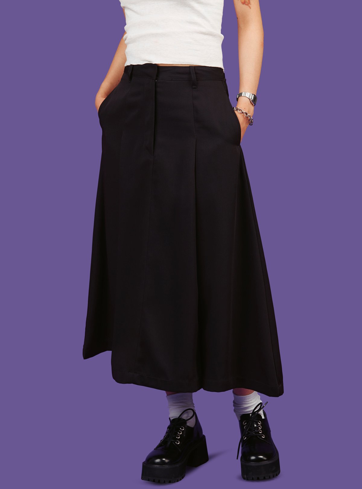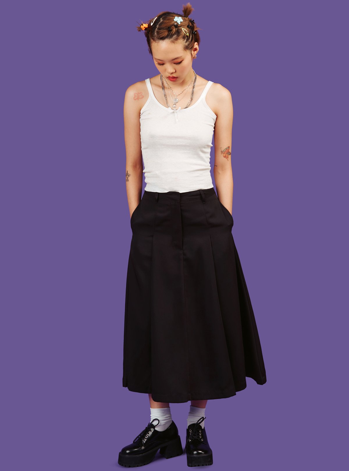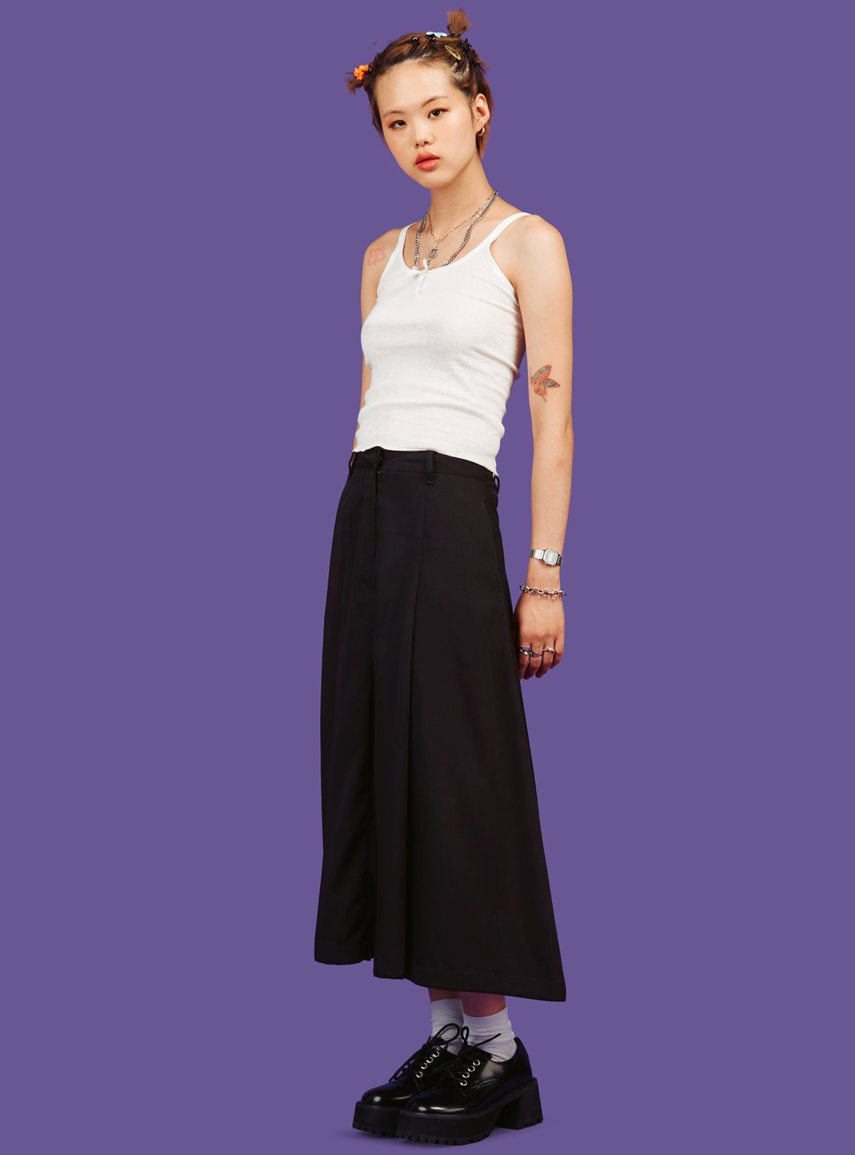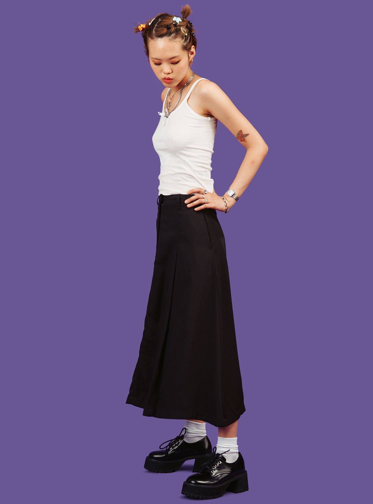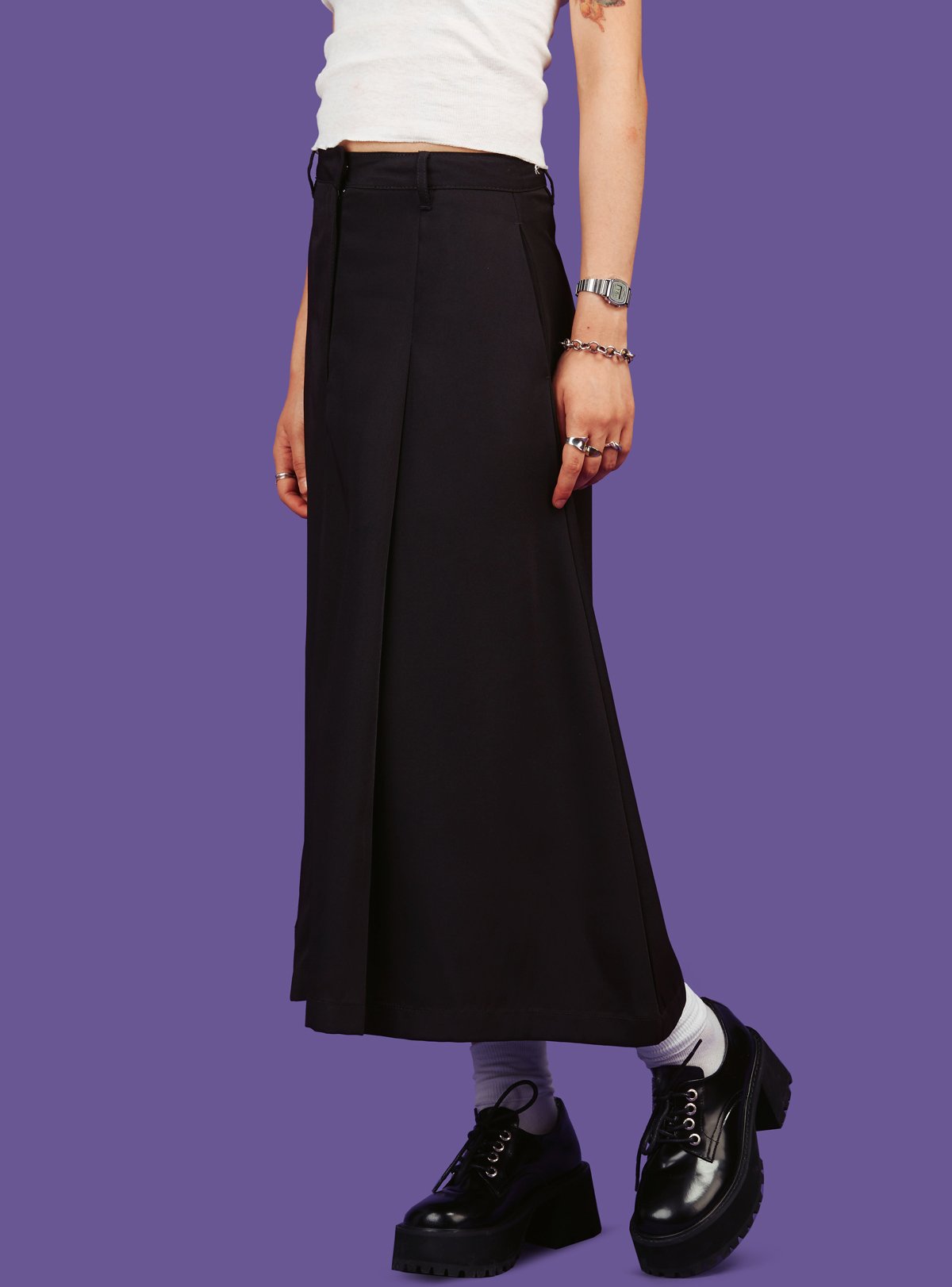 Pleated mid-rise maxi skirt with side welt pockets, belt loops, button and zipper front closure.